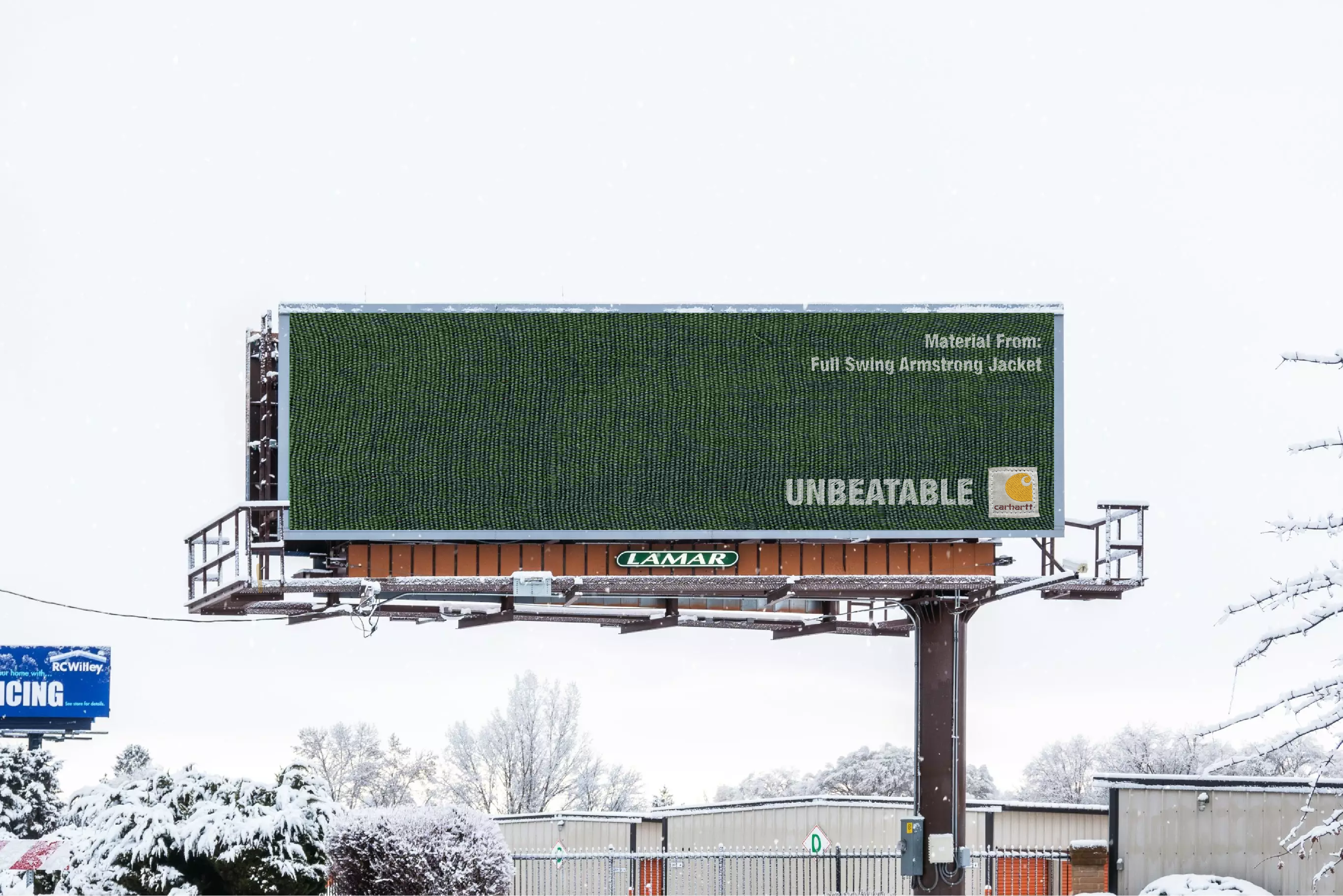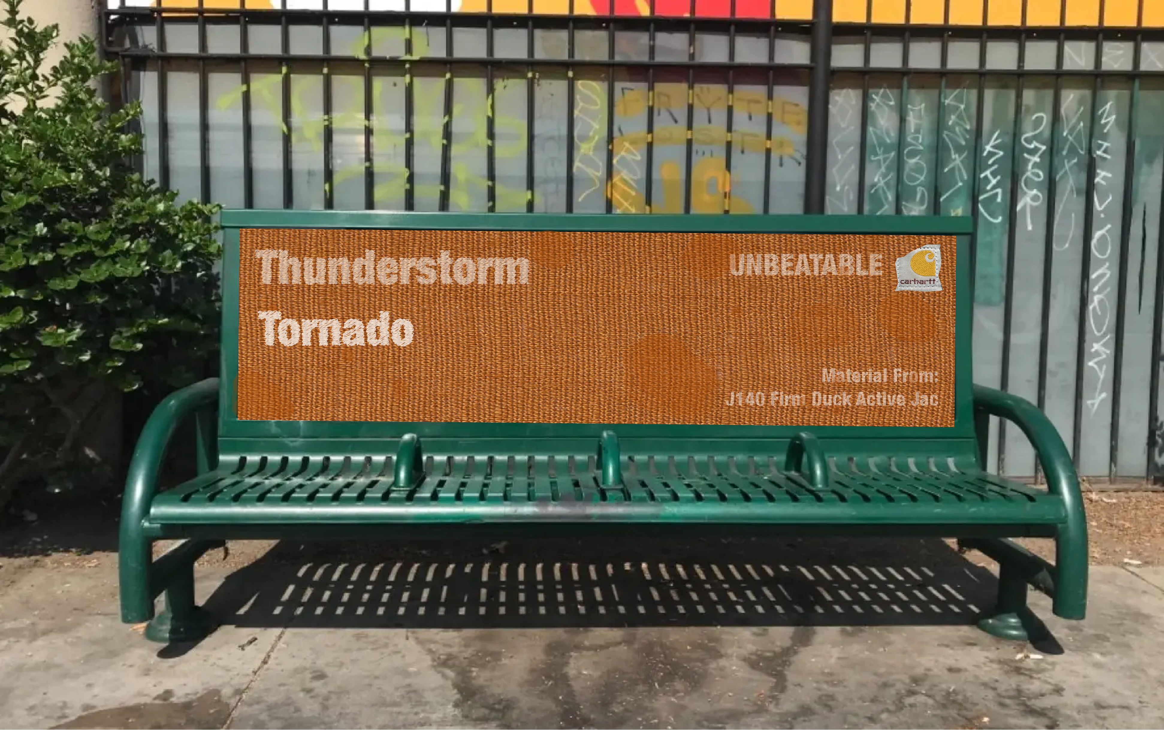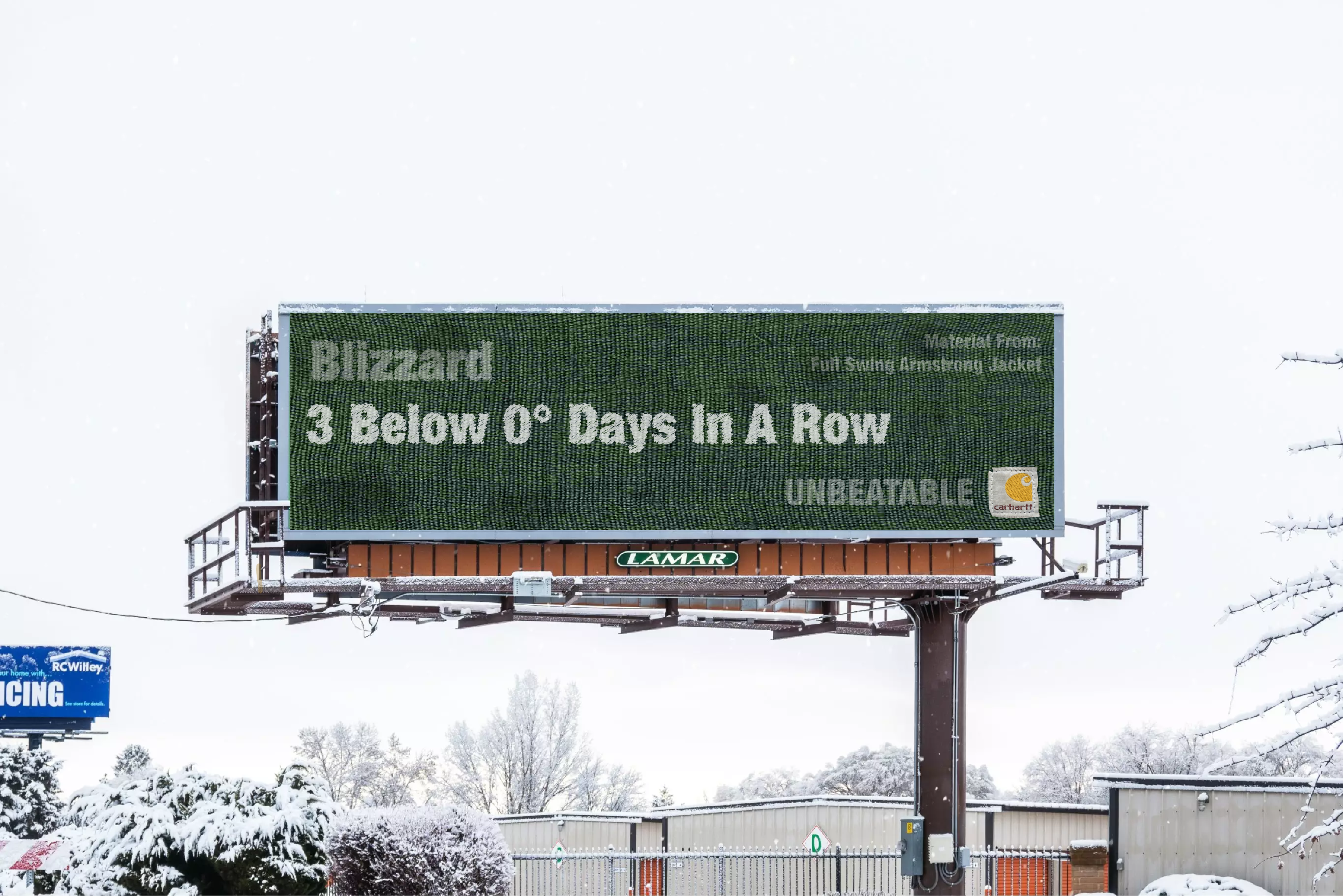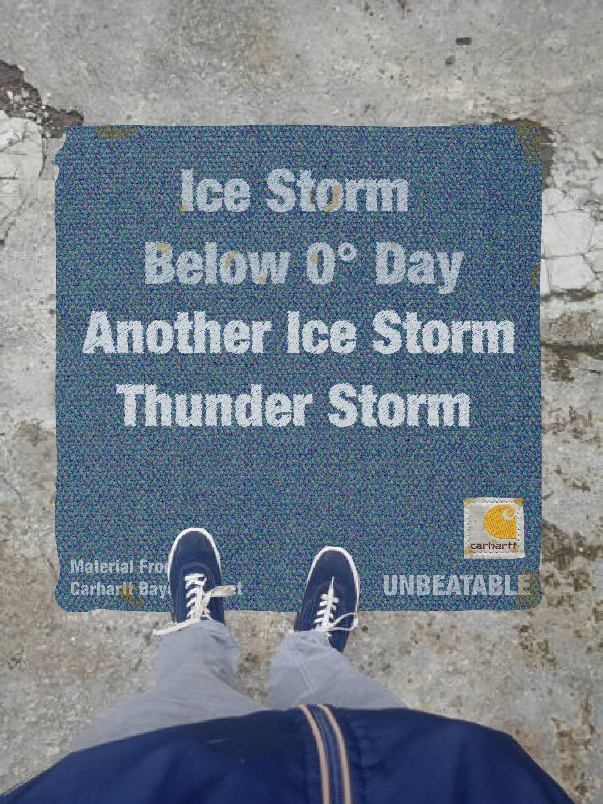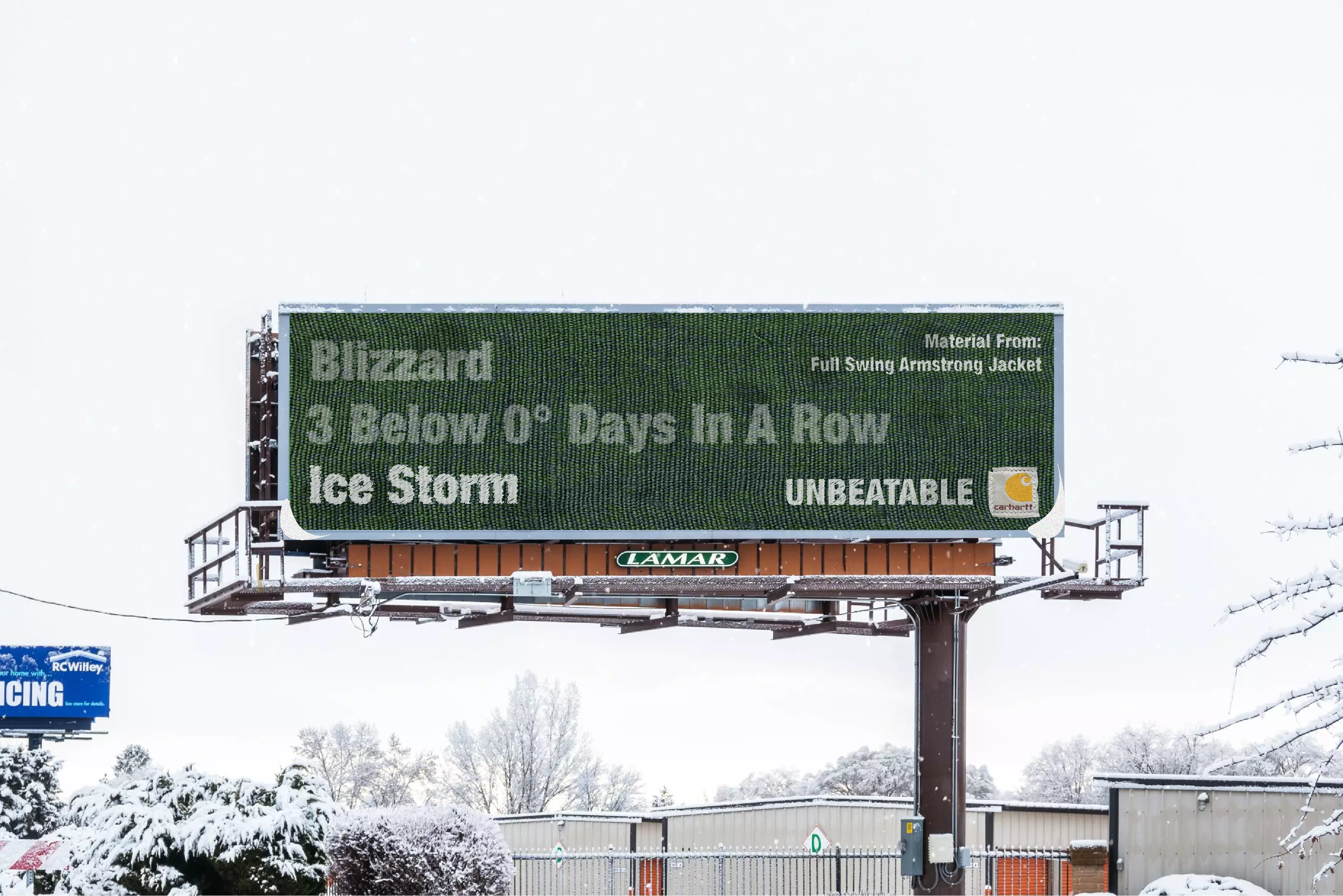 Our Out Of Home Ads brings the fabric of the famous Carhartt jackets into the real world weather conditions. Real fabric will be plastered on bus stops, billboards, and sidewalks. What will come after is the documentation of weather events. From blizzards to thunderstorms to tornados, these weather events will be recorded through this advertisement.
